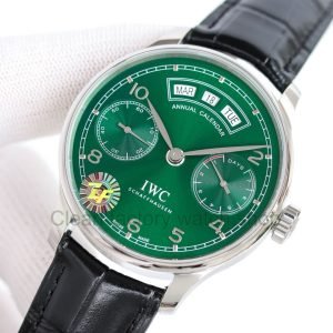 Copy ZF Factory IWC Portuguese Annual Calendar IW503510 44mm Steel Leather Strap Arabic Numerals Green Dial