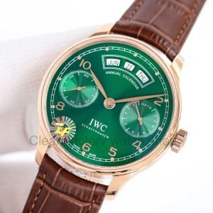Copy ZF Factory IWC Portuguese Annual Calendar IW503510 44mm Rose Gold Leather Strap Arabic Numerals Green Dial