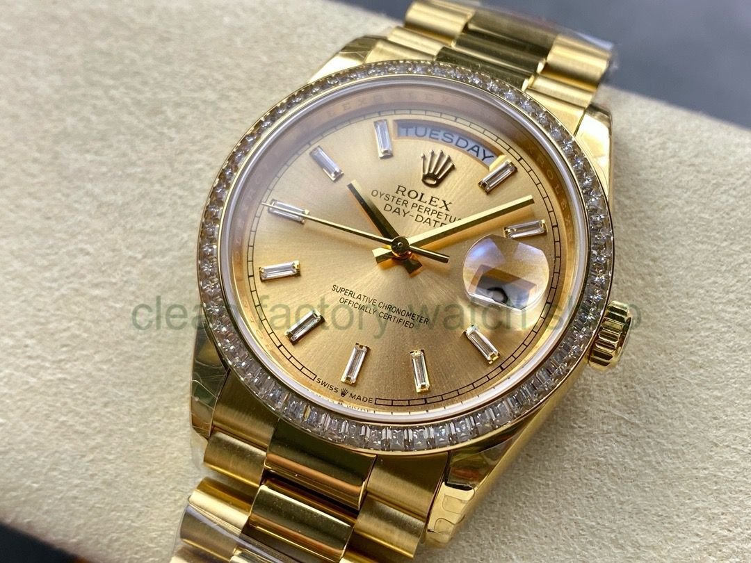 8+ Factory ‘Counterweight’ Rolex Day-Date 128398TBR-0037 36mm Diamond Bezel Full Yellow Gold Baguette Diamond Champagne Dial
