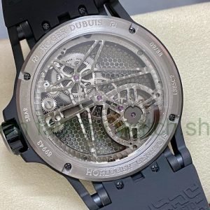 3. Dial: It uses a hollow dial, luminous scales, and the black DLC-coated titanium alloy seconds dial is printed with a black minute circle and the words Roger Dubuis. The hands are covered with luminous coating, making reading simple and clear.