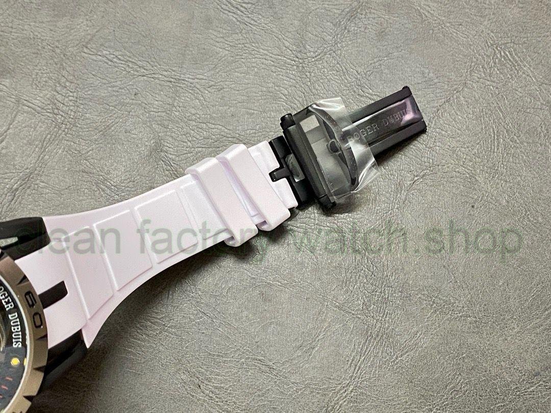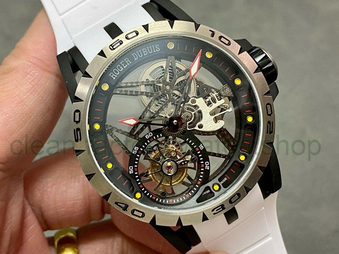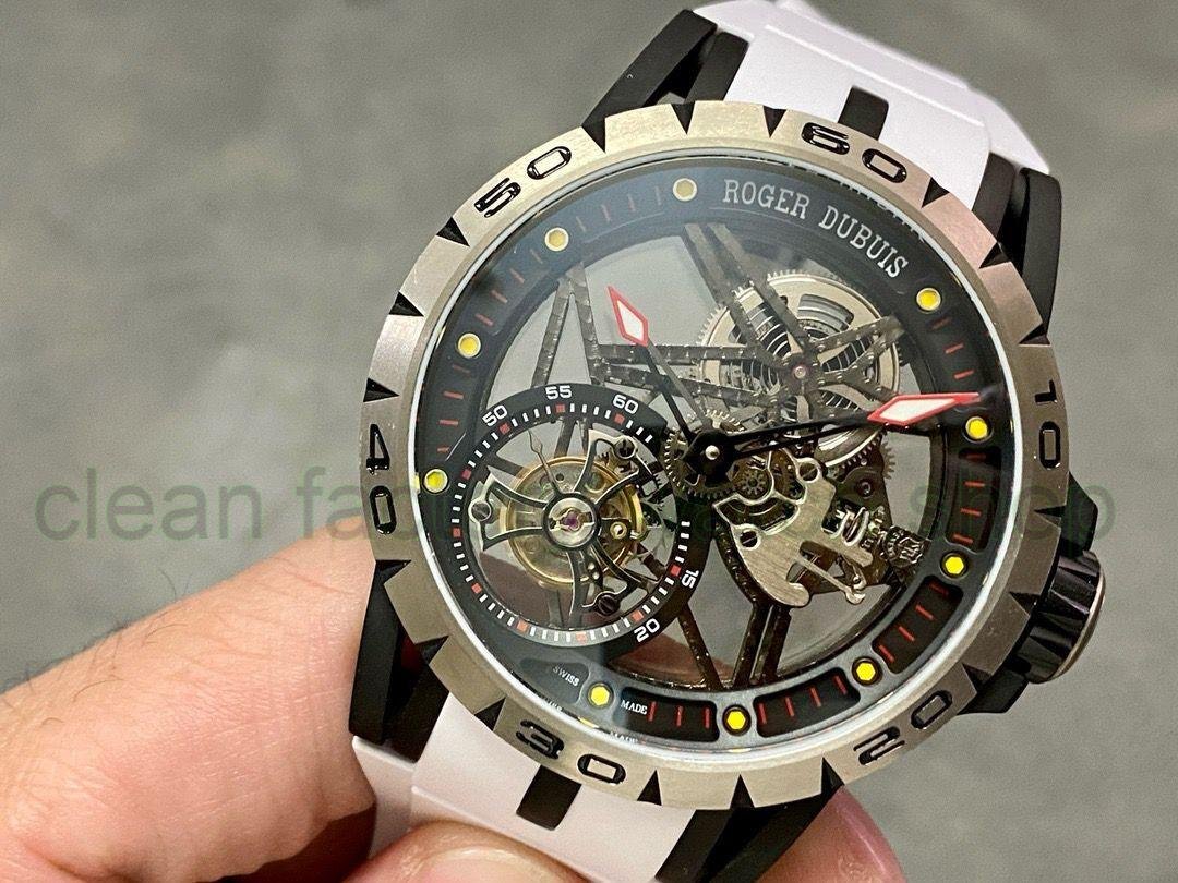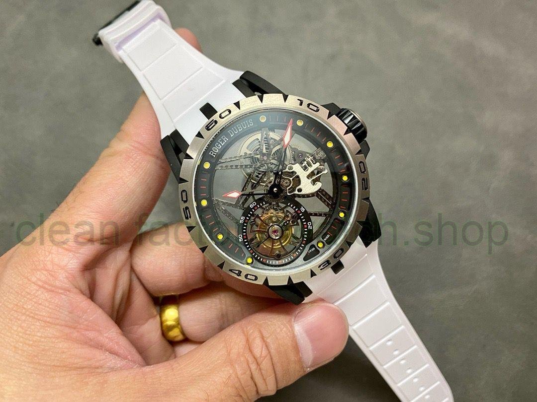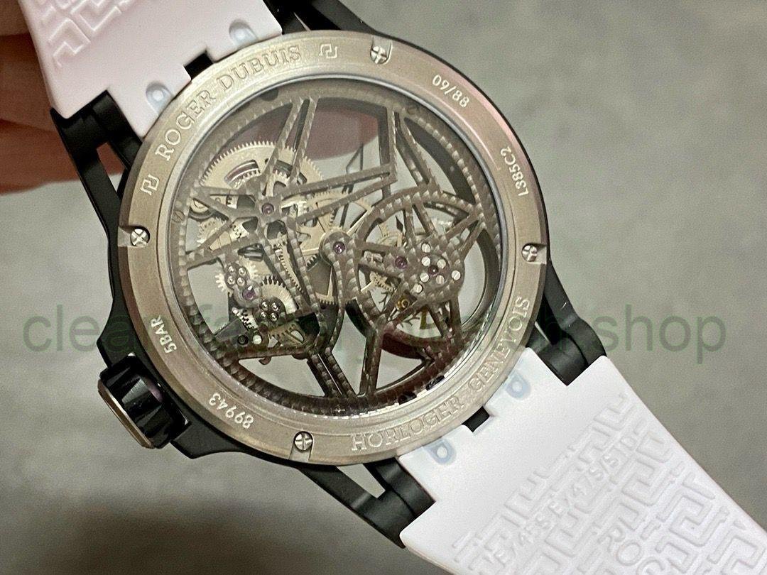 3. Dial: It uses a hollow dial, luminous scales, and the black DLC-coated titanium alloy seconds dial is printed with a black minute circle and the words Roger Dubuis. The hands are covered with luminous coating, making reading simple and clear.