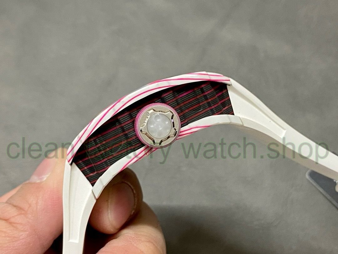 The new bezel and bottom cover are made of pink and white quartz carbon fiber composite materials, while the middle case is made of carbon fiber and pink quartz carbon fiber. Each case has a unique interlaced texture. The trapezoidal barrel-shaped case can fit the wrist more comfortably and closely, and the top of the crown cleverly imitates the concave and convex shape of a golf ball, which is a quite interesting detail.