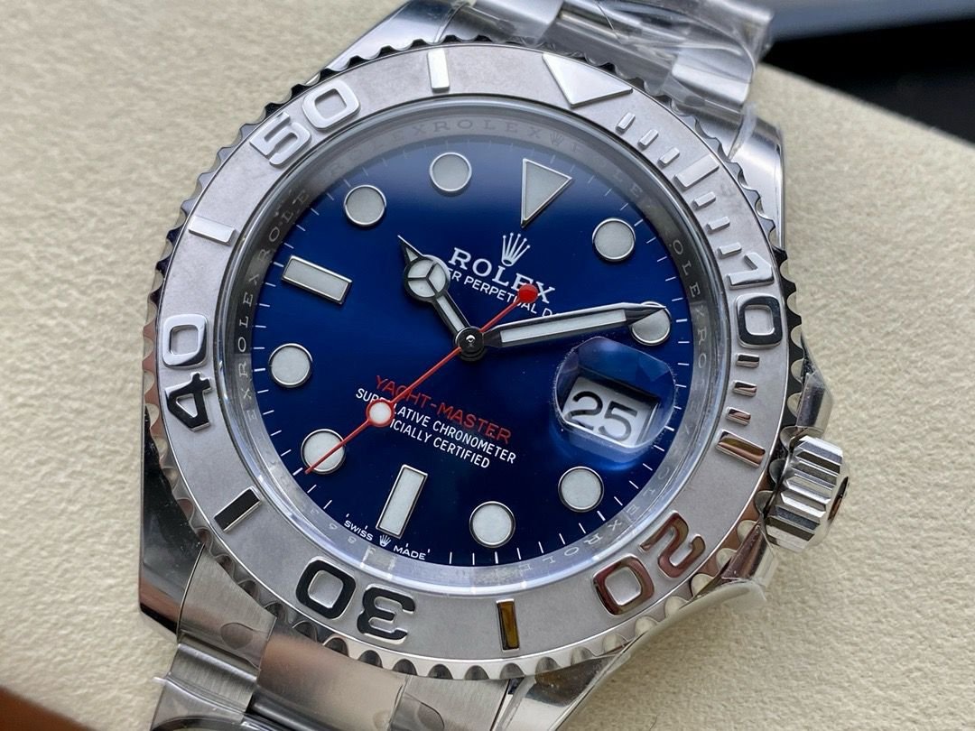 Clean Factory Rolex Yacht-Master 40mm series watch with a grey dial may appear to have a significant color difference due to being photographed in a softbox, but under natural light, the similarity to the genuine product is over 95%. The blue dial is slightly lighter compared to the authentic version. Of course, the characteristic of the sunburst dial is that it displays different colors under different lighting conditions. Precisely, as long as the RGB color values are based on a standard, the overall deviation won’t be significant. Clean Factory employs the same PVD plating process as the genuine product for all sunburst dials, such as those on the Submariner, Datejust, and this Yacht-Master. The advantage is that the color of the product remains consistent across different batches without tonal differences. Additionally, the thin plating layer allows the sunburst texture underneath to be clearly visible, though this comes with higher costs.