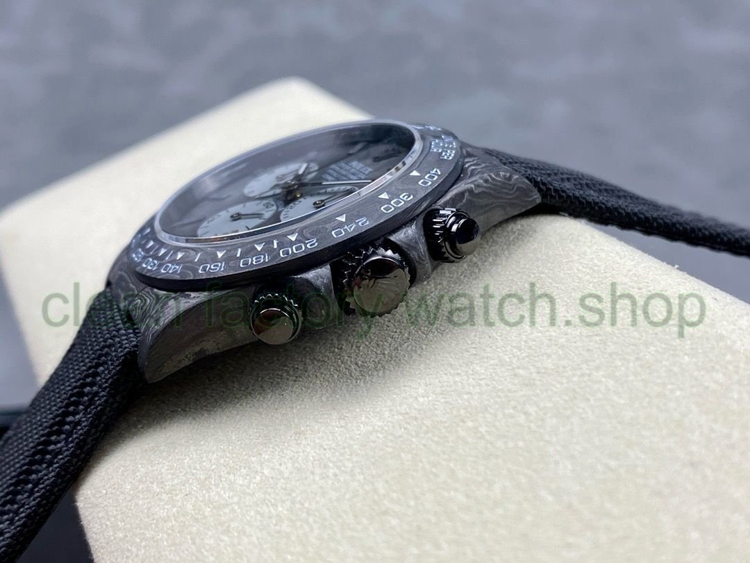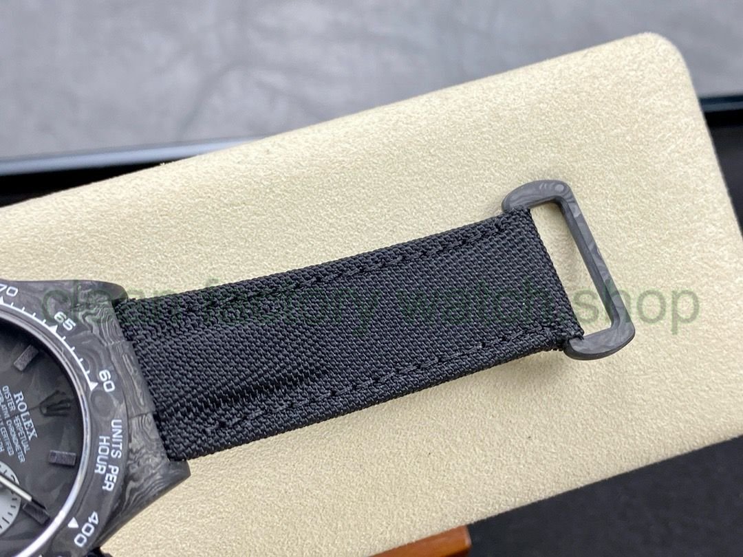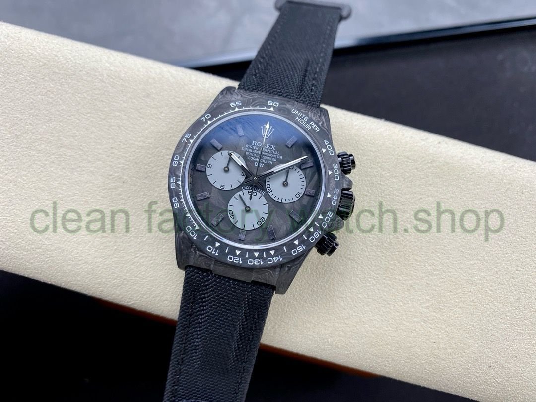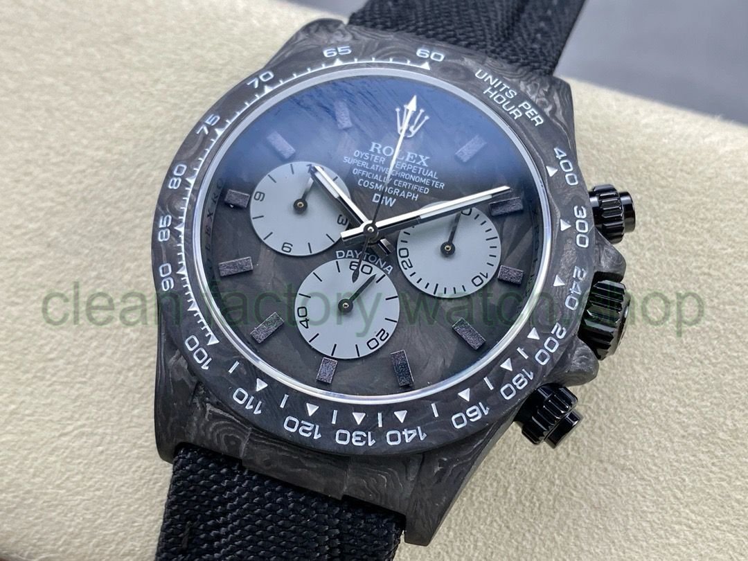 DIW new product, super carbon fiber Diw customized version 4130 Universe Chronograph Daytona series. The diameter of the watch is 40MM, which is the same size as the ordinary Daytona. The entire watch weighs 53 grams. The entire watch case is made of carbon fiber. Carbon fiber is a new type of material. The color is timeless black, and the overall texture is very elegant and luxurious. Carbon fiber is soft on the outside and rigid on the inside. It is lighter than metal aluminum, but stronger than steel, and is corrosion-resistant. The matte black case has various textures, and each carbon fiber watch will show different textures due to different cutting methods, making it unique. The strap is a Velcro design, made of nylon on the front, cowhide on the back, and the buckle is also made of carbon fiber.