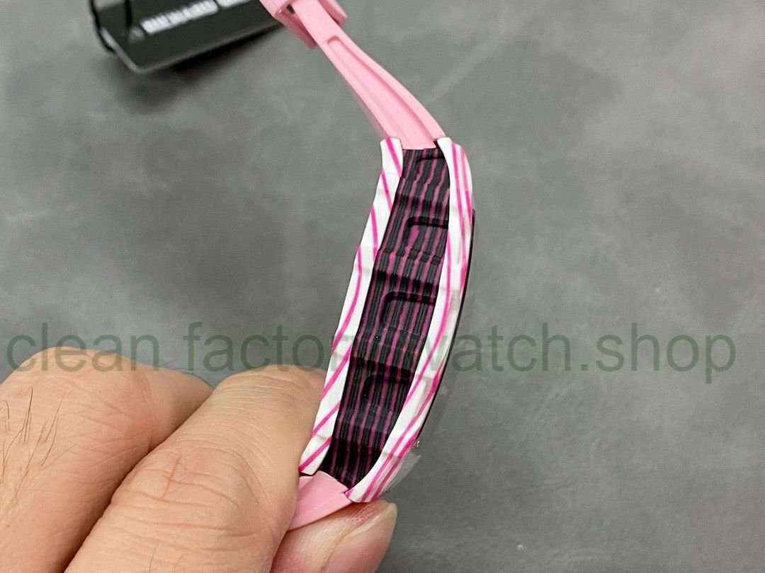 The new bezel and bottom cover are made of pink and white quartz carbon fiber composite materials, while the middle case is made of carbon fiber and pink quartz carbon fiber. Each case has a unique interlaced texture. The trapezoidal barrel-shaped case can fit the wrist more comfortably and closely, and the top of the crown cleverly imitates the concave and convex shape of a golf ball, which is a quite interesting detail.