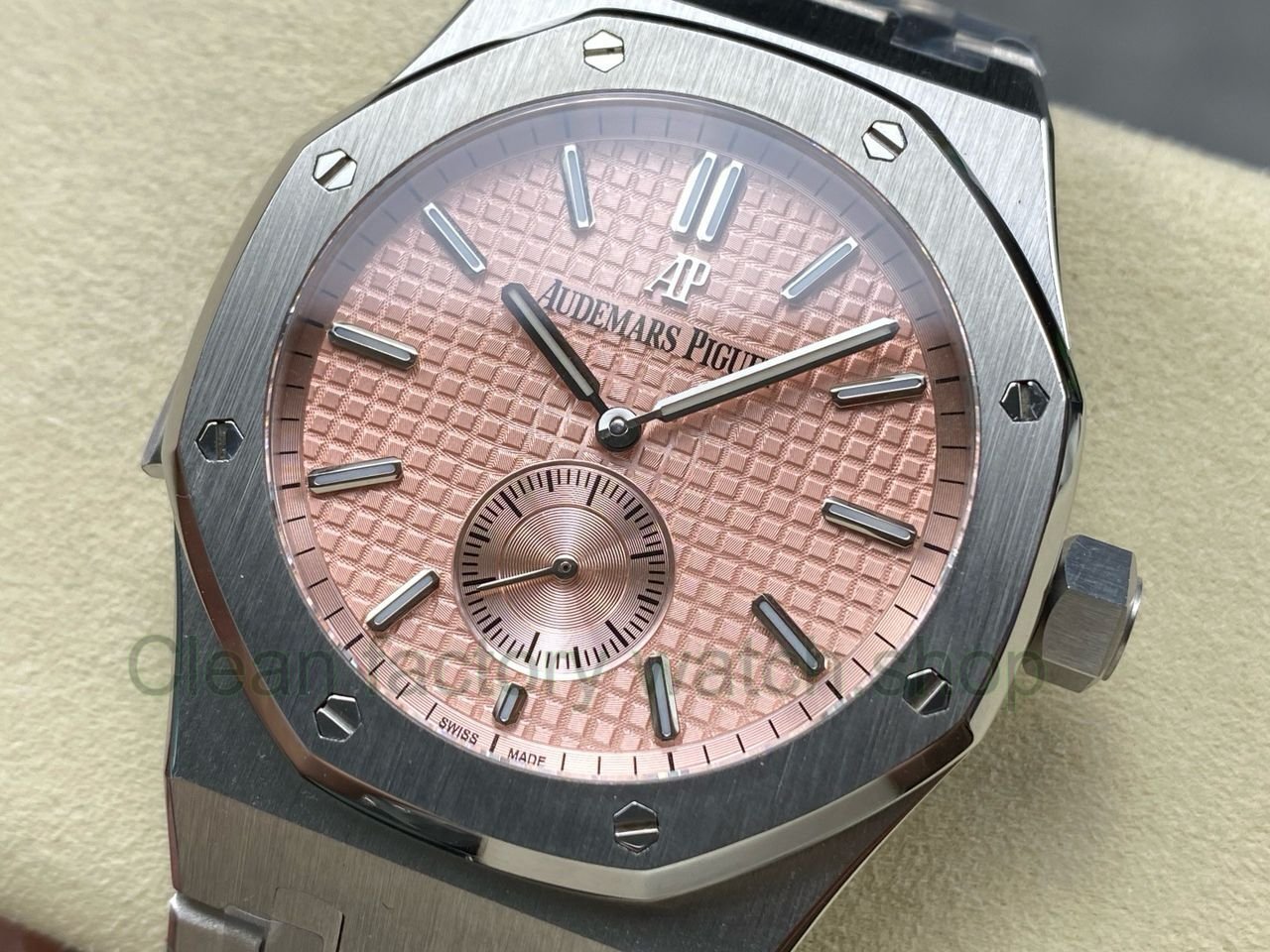 5.Textured Dial Excellence: Features a deeply embossed “Grande Tapisserie” waffle texture, paired with luminous white gold hour markers and the iconic Royal Oak hands — delivering clarity and sophistication day or night.
