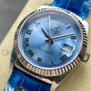 8+ Factory ‘counterweight’ Rolex Day-Date 36mm 128236-0008 White Gold Crocodile Leather Strap Roman Numerals Ice Blue Dial