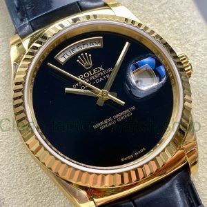 8+ Factory ‘counterweight’ Rolex Day-Date 36mm 18038 Yellow Gold Crocodile Leather Strap Black Dial