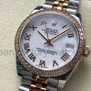 8+ Factory Rolex Counterweight Datejust 278381RBR-0004 31mm Diamond Rose Gold Bezel Half Rose Gold Roman Numerals White Dial Jubilee