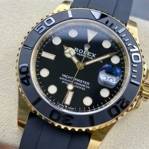Clean Factory Rolex Yacht-Master 226658-0001 42mm Yellow Gold Rubber Strap Black Dial