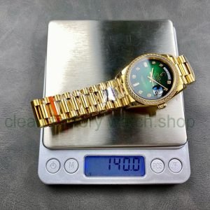 8+ Factory ‘Counterweight’ Rolex Day-Date 128348RBR-0078 36mm Diamond Bezel Full Yellow Gold Baguette Diamond Green Dial