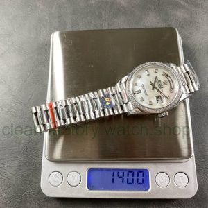 8+ Factory ‘Counterweight’ Rolex Day-Date 128349RBR-0004 36mm Diamond Bezel Full White Gold Diamond Mope&Baguette Diamond Mother Of Pearl Dial