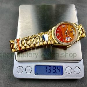 8+ Factory ‘Counterweight’ Rolex Day-Date 128348RBR-0049 36mm Diamond Bezel Full Yellow Gold Roman Numerals&Diamond Red Ombré Dial