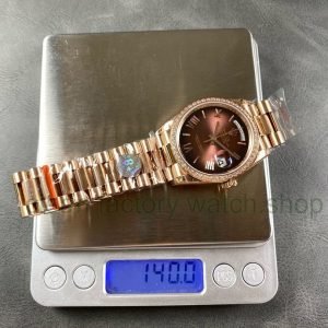 8+ Factory ‘Counterweight’ Rolex Day-Date 128345RBR-0075 36mm Diamond Bezel Full Rose Gold Roman Numerals Brown Dial
